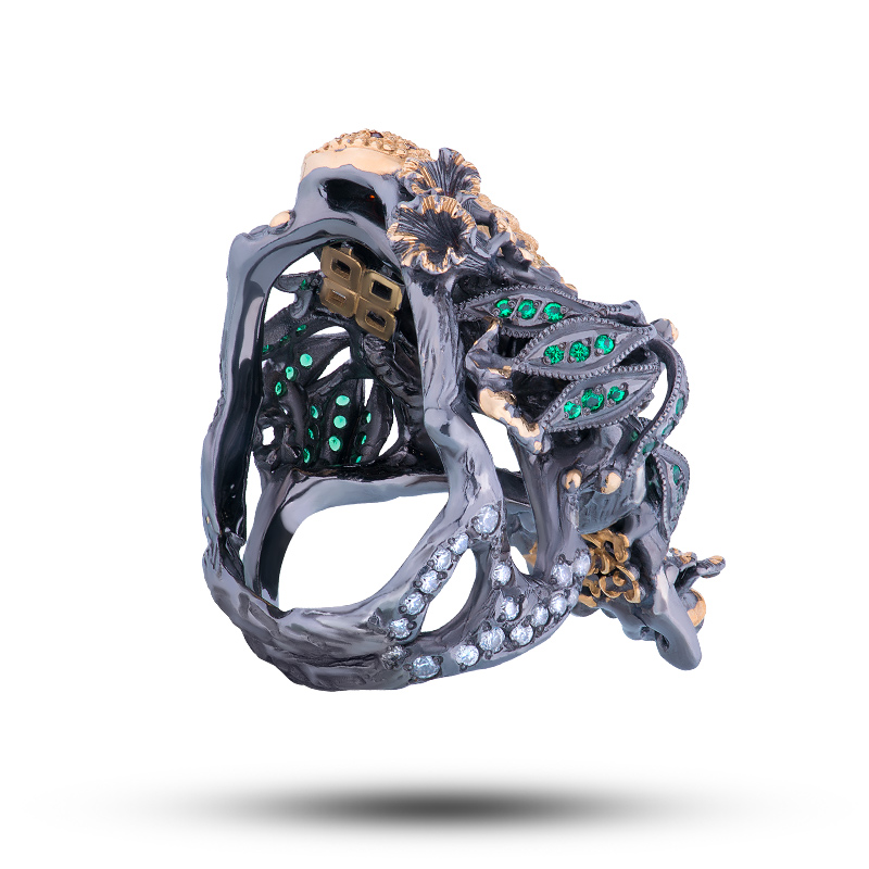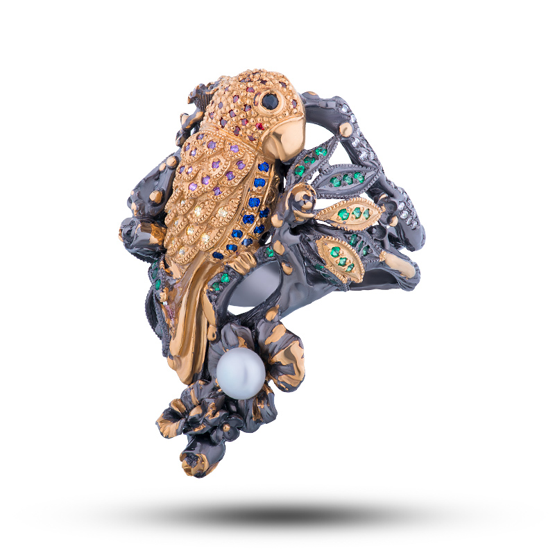 Кольцо "Попугай", камни фианит, шпинель, размер 18