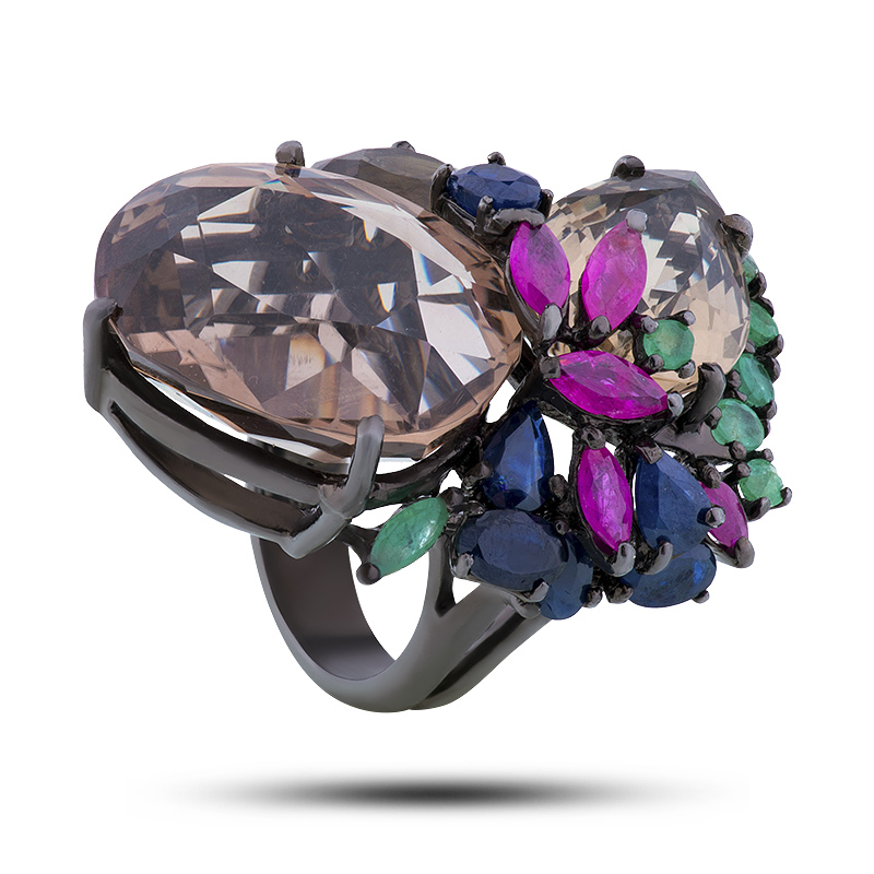 Кольцо, камни раухтопаз, рубин, сапфир, цитрин, размер 17,75