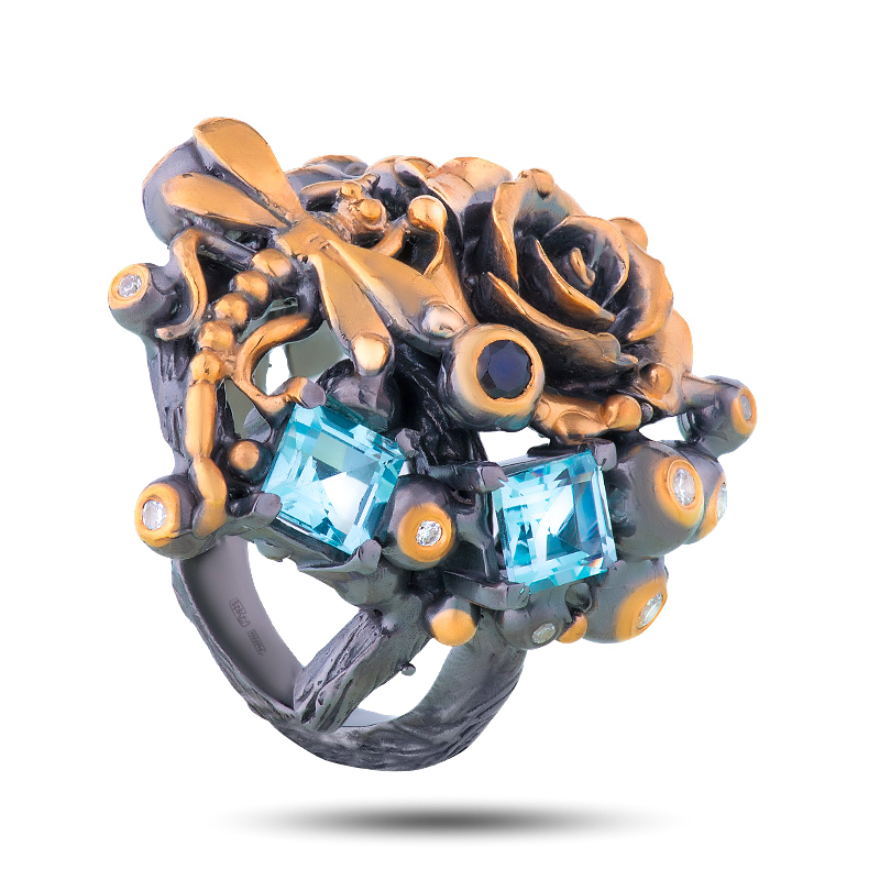 Кольцо "Стрекоза", камни топаз, шпинель, фианит, размер 17,5