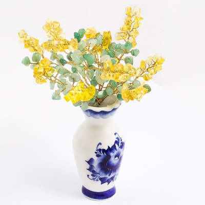 Букет мимозы в вазе гжель, Камень цитрин, нефрит