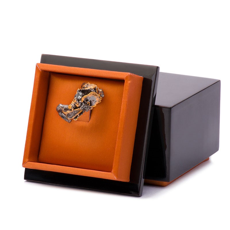 Драгоценный камень празиолит Оправа серебро, покрытие черный родий, золочение