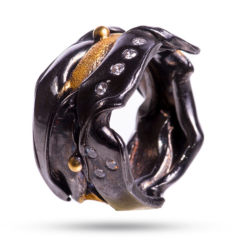 Драгоценный камень фианит Оправа серебро, покрытие черный родий, золочение