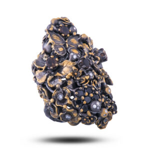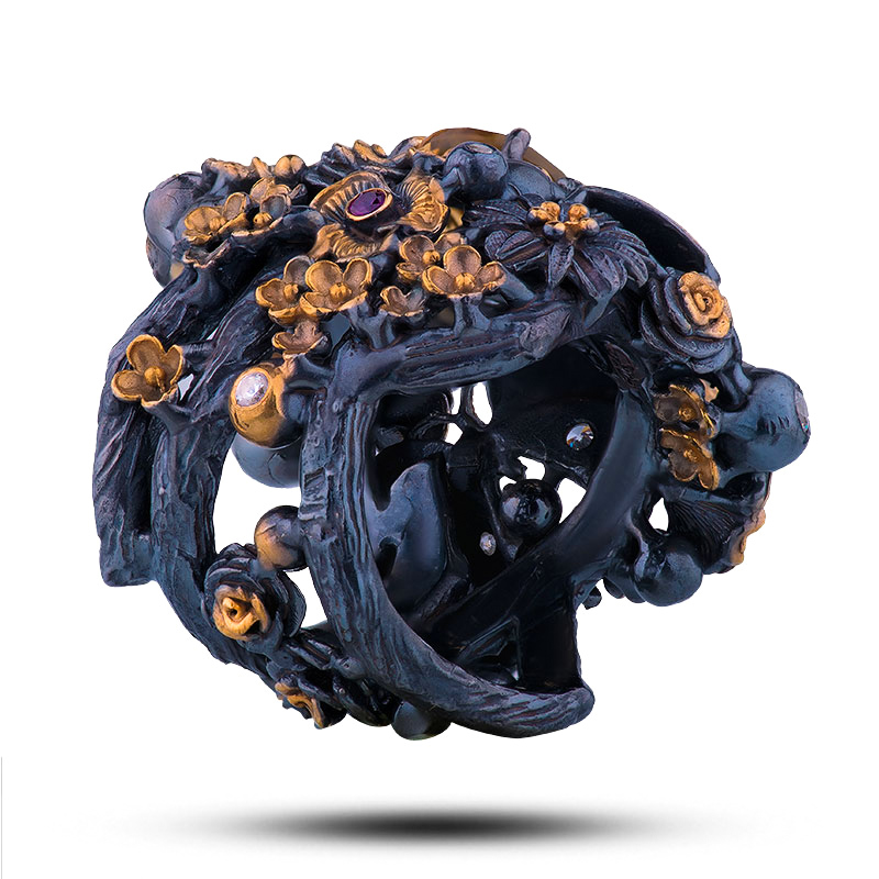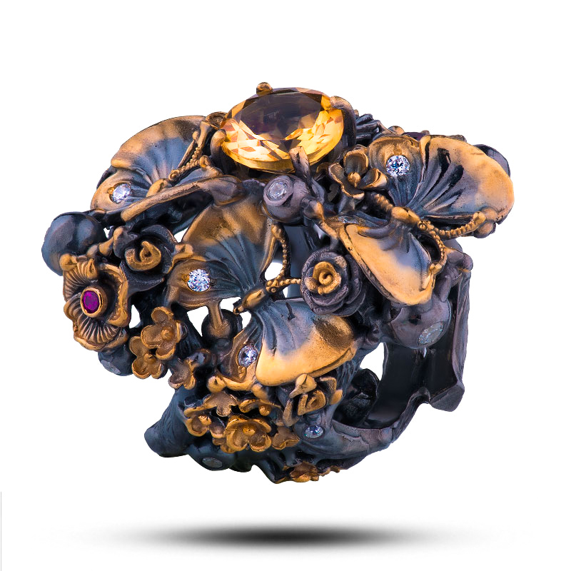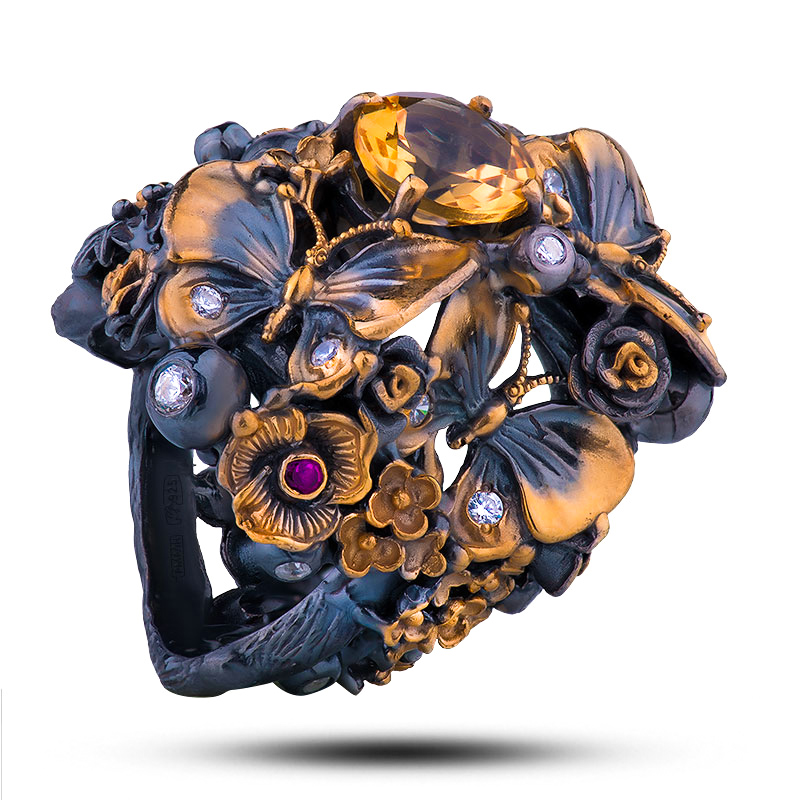 Серебряное кольцо с драгоценными камнями «Мотыльки» из испанской коллекции Denisov & Gems. Оправа из серебра 925 пробы, родированием (черный родий) и с золочением. Вставка: камни цитрин, родолит, фианиты.