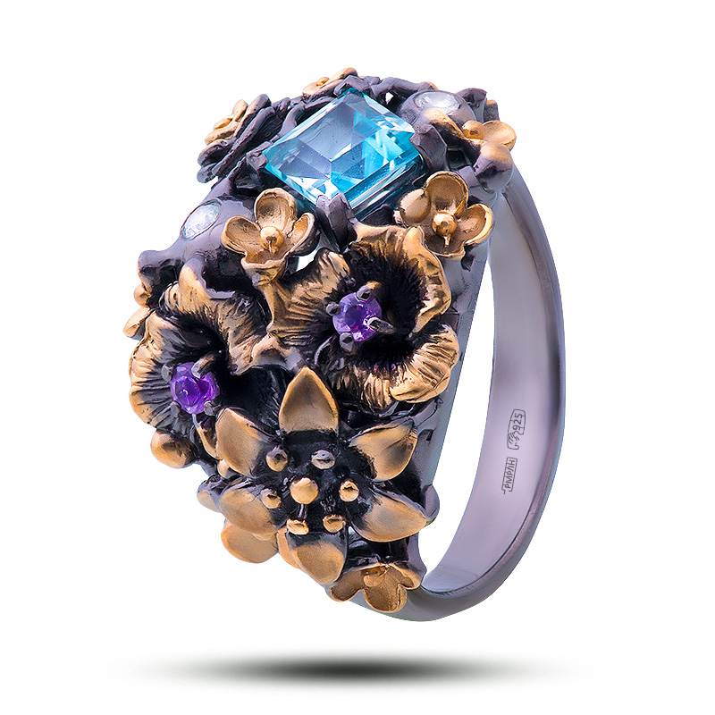 Кольцо "Нимфа", камни топаз, аметист, фианит, размер 17