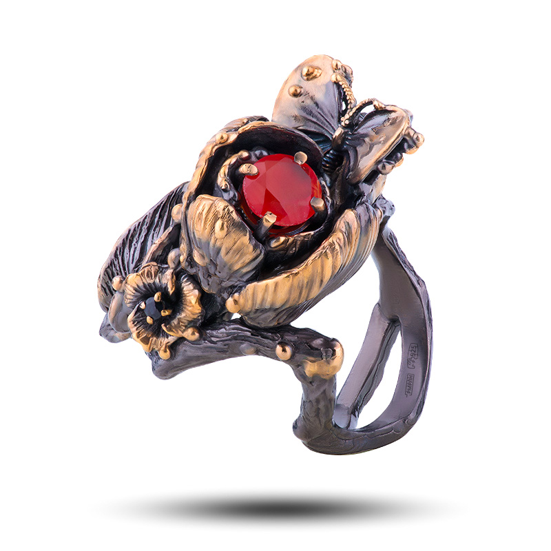 Кольцо "Тюльпан", камни сердолик, шпинель, размер 17,75