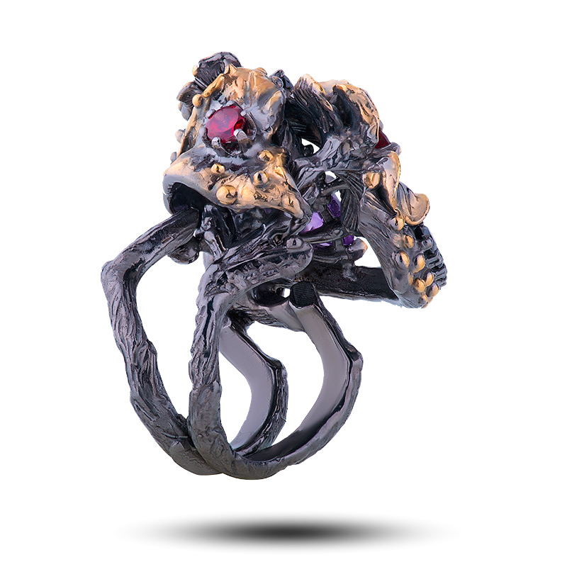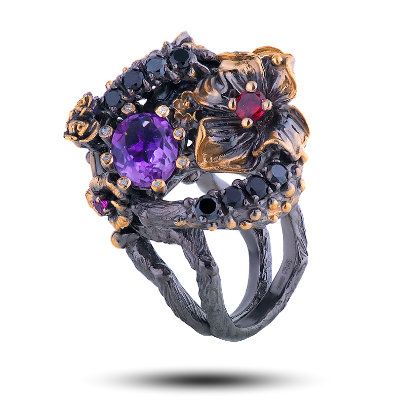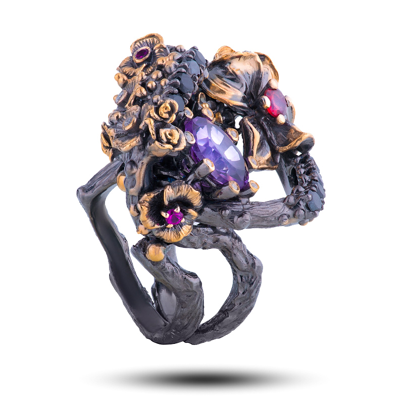Кольцо "Вальс цветов", камни аметист, гранат, шпинель, родолит, фианит