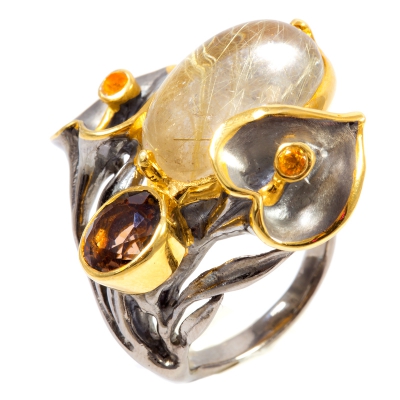 Кольцо "Лев", камни волосатик, раухтопаз, цитрин, размер 18
