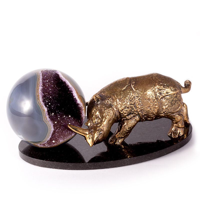 Фигурка "Носорог с шаром" из камня аметист, основание празиолит