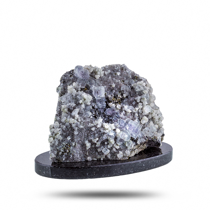 редкий коллекционный минерал флюорит, кварц, галенит на подставке.