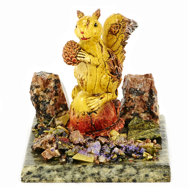 Композиция из камня "Белка с орехом" Драгоценный камень змеевик, литьевой мрамор