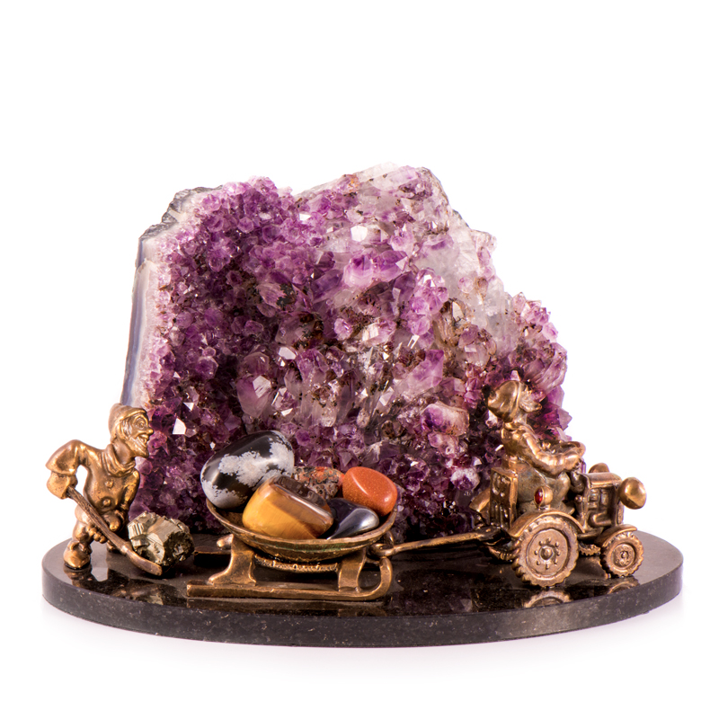 Фигурка "Гном с трактором" из камня аметист, основание празиолит