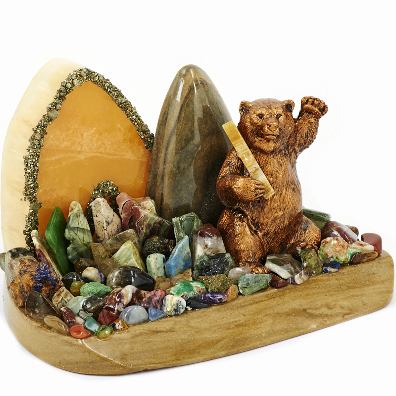 Фигурка "Медведь", камни змеевик, пирит, селенит, розовый кварц, яшма, кахолонг, литьевой мрамор