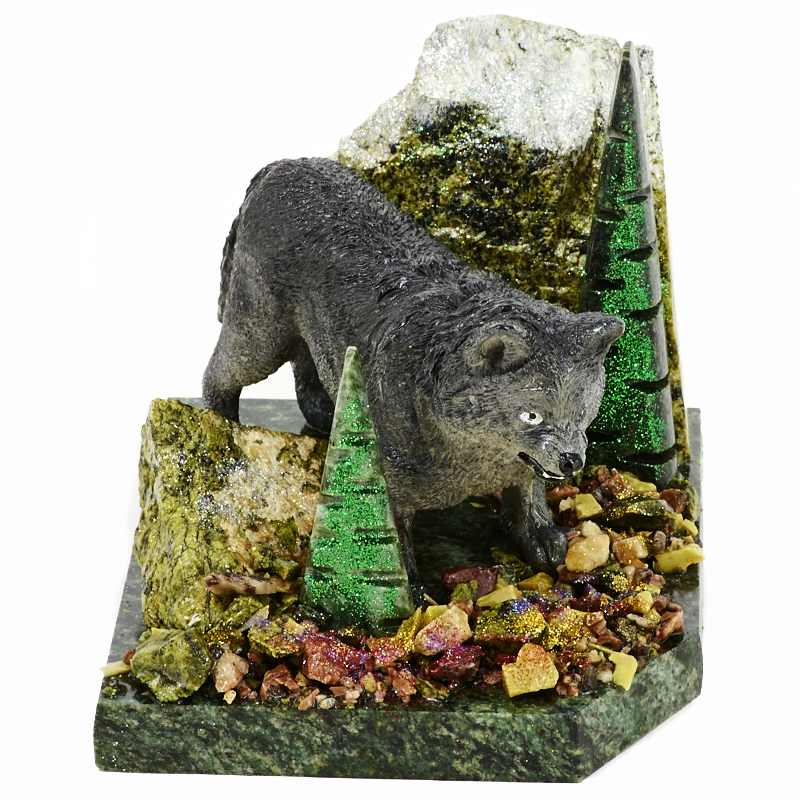Композиция из камня "Волк" Драгоценный камень змеевик, литьевой мрамор