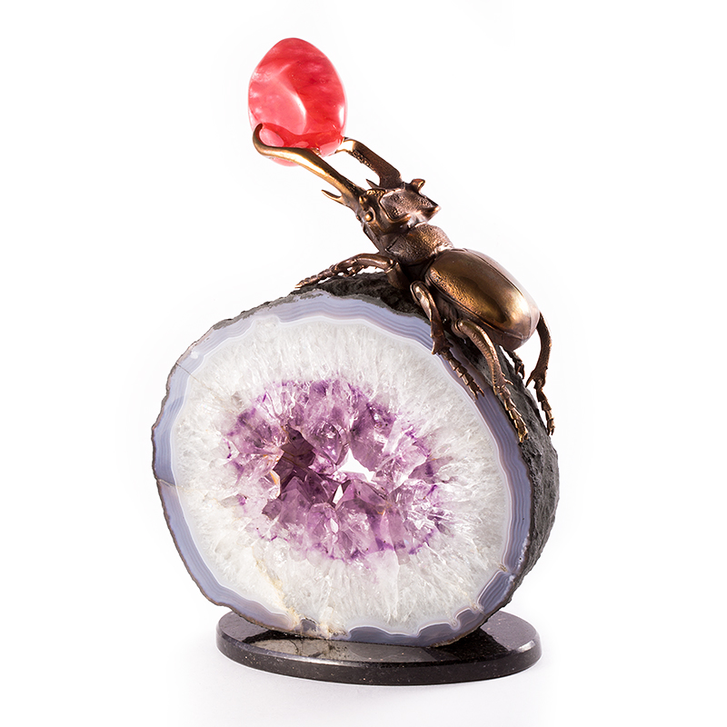 Фигурка "Жук-олень" из камней аметист, вулканическое стекло, основание празиолит