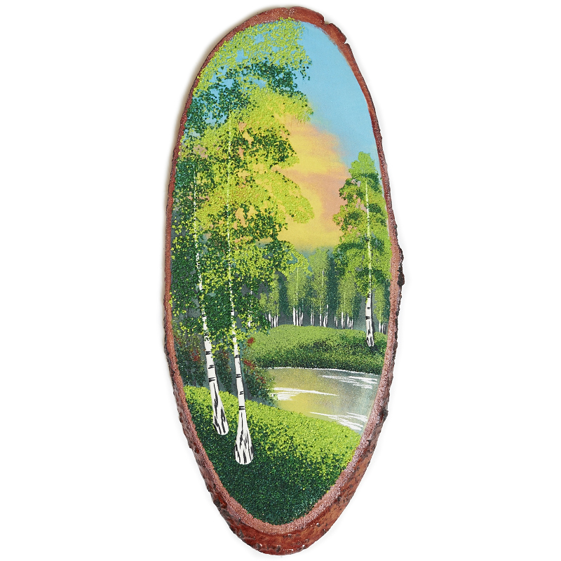 Срез дерева "Березы у воды", камни малахит, хризолит, 700 мм