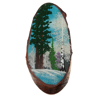 Срез дерева "Сосны зимой", камни змеевик, чароит, малахит, 300 мм