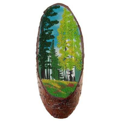Срез дерева "Лес", камни змеевик, чароит, малахит, 26 см