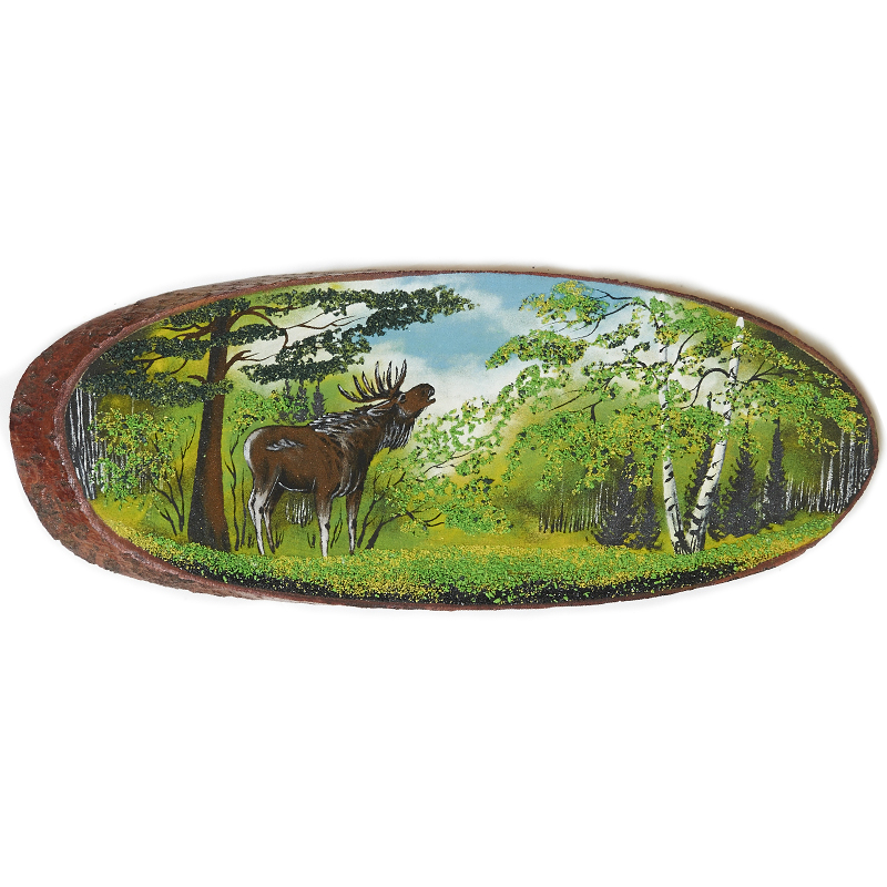 Срез дерева "Лось", камни хризолит, малахит, 80 см