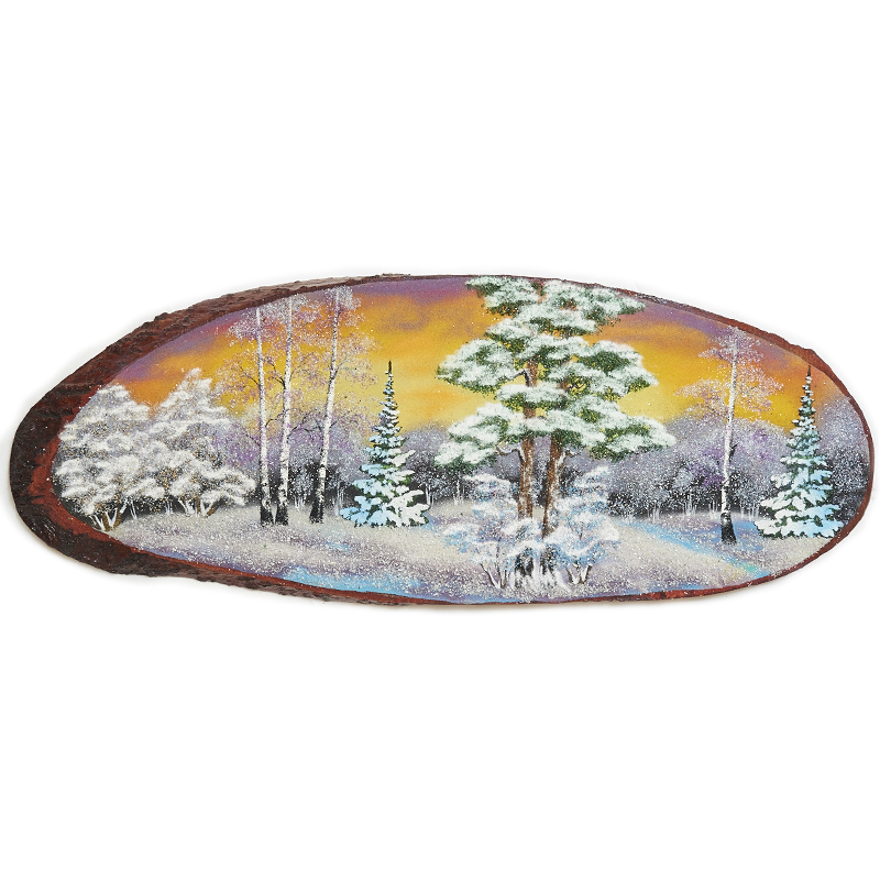Срез дерева "Зимний закат", камни малахит, топаз, горный хрусталь, 80 см
