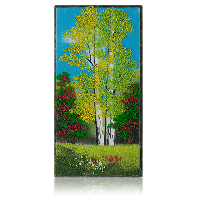 Срез каменный "Две березы", камни змеевик, чароит, малахит, 200 мм