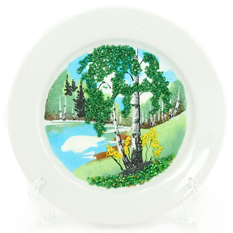 Фрфоровая декоративная тарелка на стену с насыпным рисунком «Березки» Камень цитрин, хризолит и другие камни самоцветы Ручная работа; Диаметр: 175 мм